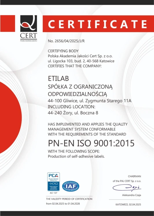 Det prioriterade målet för Etilab Sp. z o.o., med säte i Gliwice, är att kontinuerligt uppfylla våra kunders krav genom att uppnå och upprätthålla en hög kvalitetsnivå vid tillverkning av självhäftande etiketter.
